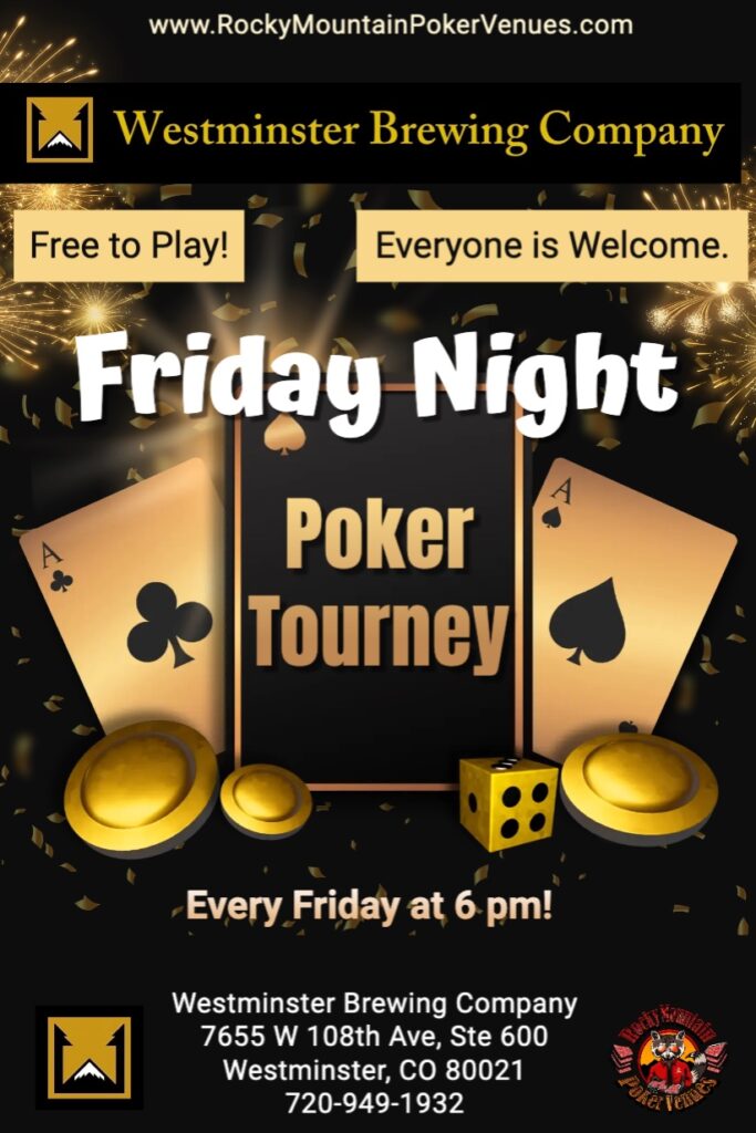 Westminster Brewing Company located at 7655 W 108th Ave #600, Westminster, CO 80021 hosts Texas Hold’em poker every Friday at 6 pm.  The taproom offers great craft beer and bar snacks.  A food truck is also often available on Friday nights.  Get there early to secure your seat and enjoy a fun night of poker.