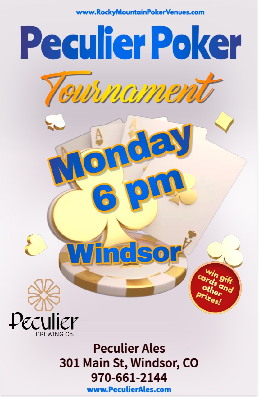 Peculier Ales Fort Collins hosts free to play Texas Hold'em poker every Sunday at 4 pm. Win gift cards and other prizes. Also earn bonus chips for the Peculier Brewing Quarterly Poker Tournament.
