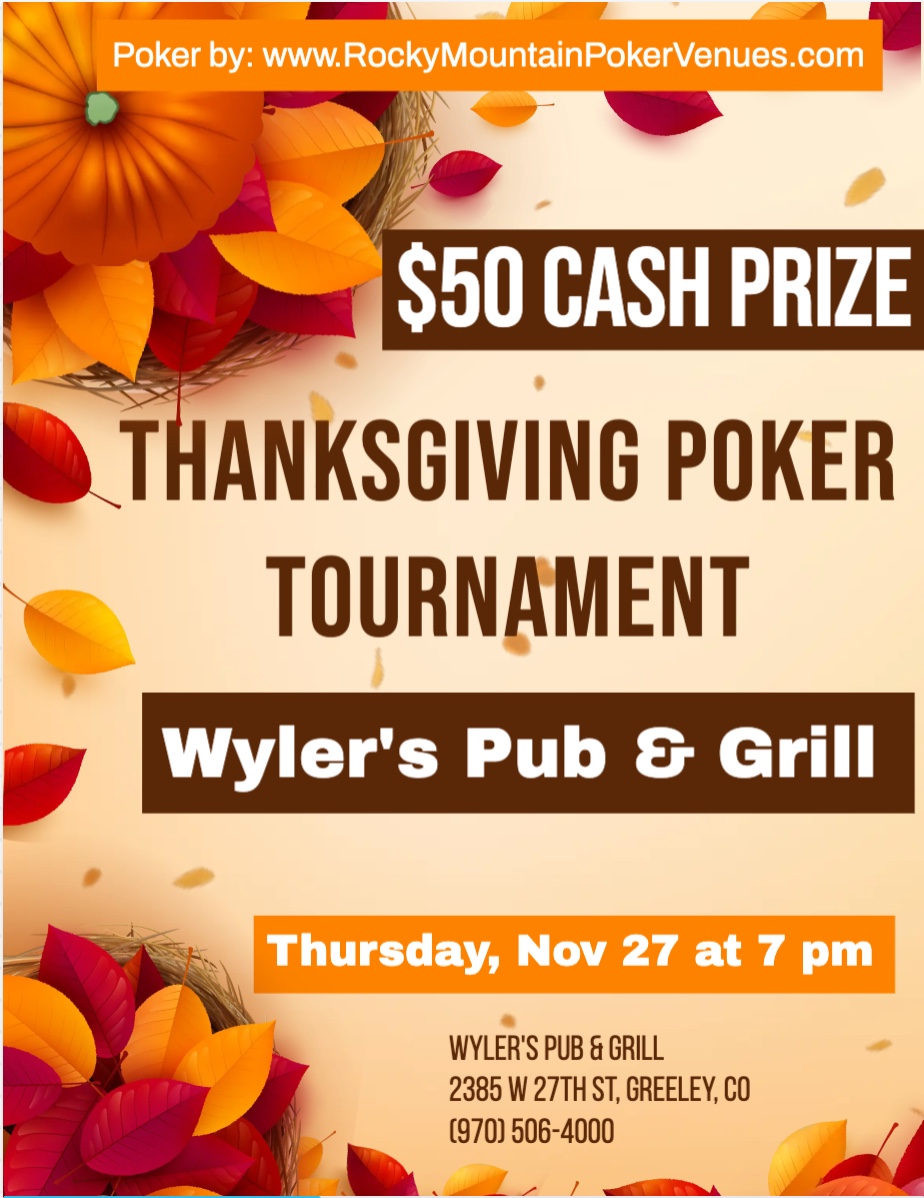 Wyler's Pub & Grill hosts FREE bar poker every Monday at 7 pm and on Saturday at 6 pm. Win bar tabs and other prizes. Earn bonus chips for the Wyler's Pub Quarterly Poker Tournament. Call (970)-506-4000 for more information. |